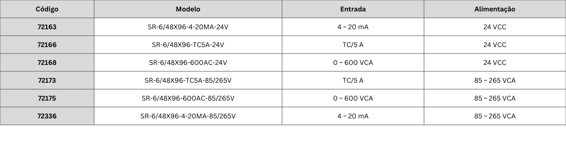 O SR-6/48X96 é um indicador digital compacto para monitoramento em tempo real de variáveis elétricas e de processo. Com display LED de alto brilho e formatos de indicação configuráveis, atende aplicações que exigem leitura clara, rápida e confiável. Os modelos cobrem entradas padrão de corrente e tensão, medição via shunt e via transformador de corrente 5 A, com opções de alimentação em 24 VCC ou universal 85–265 VCA.